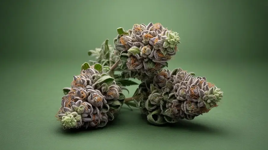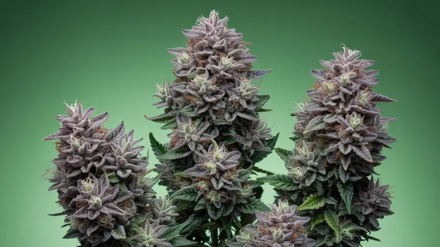 Color: Expect deep green buds with purple highlights and thick white frost.