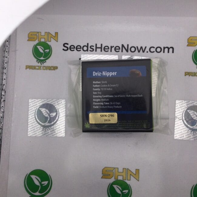 Driz-Nipper brings together Sherbert | a GSC's—Pink Panties hybrid with a Caryophyllene, Myrcene, and Limonene terpene profile producing sweet berry, citrus, and cream | and Cookies & Cream, the 2014 Denver Cannabis Cup winner that anchors much of the Exotic Genetix catalog. Together they make a dessert-forward regular that runs euphoric, relaxing, and terpene-rich. James Bean acquired this pack and placed it in the vault. Available now for the first time.