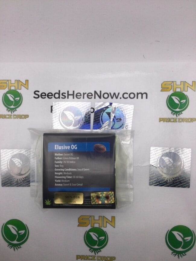 Elusive OG brings both into a regular seed cross: OG heritage on both sides, terpene expression from the Green Ribbon BX, and the collector-grade rarity of a cross built on a clone-only whose full genetics remain undisclosed. Regular seed line producing both male and female phenotypes.