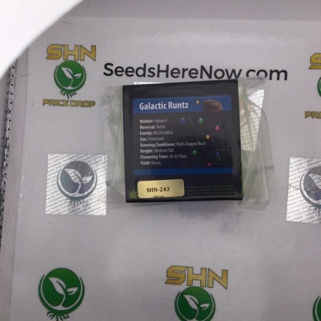 Galactic Runtz runs 60/40 indica with THC at 26-27% | toward the top of the documented range. Effects are euphoric, relaxing, and mood-lifting. The cross produces a regular seed line with both male and female phenotypes, making this pack valuable for breeders who want to work Falcon 9 through Runtz genetics.