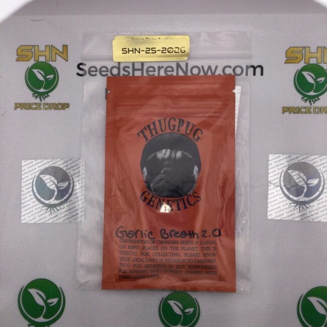 GMO Cookies (also known as Garlic Cookies) crossed with Mendo Breath F2 produced one of the most copied flavor profiles in modern cannabis—and Garlic Breath 2.0 is the Thug Pug original. This is Gromer's second iteration of the cross, selected harder for the garlic/gas layering and heavier resin than the first version. This is a Sealed pack from the original run. Limited stock—when it's gone, it's gone.