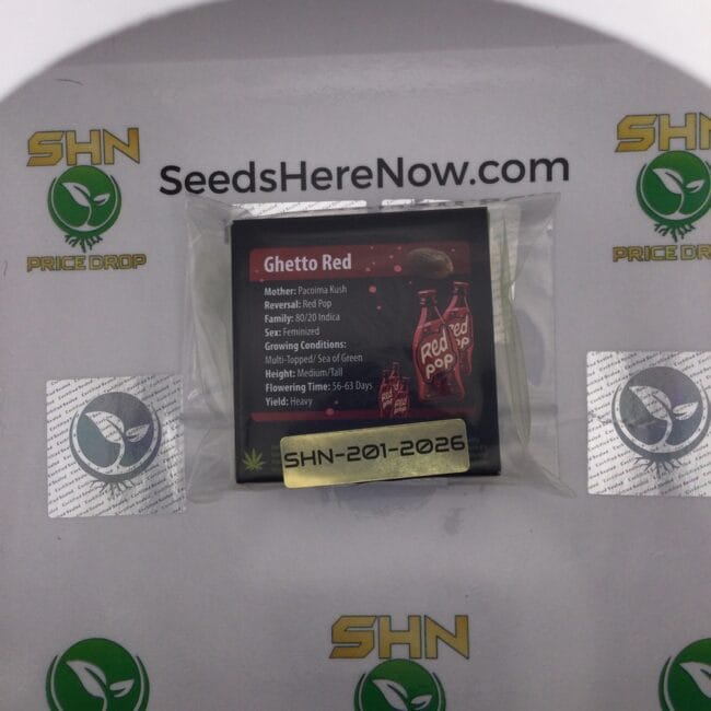 Ghetto Red crosses Pacoima Kush | an OG Kush's—Girl Scout Cookies indica-dominant hybrid | with Red Pop, the sour candy berry line that has appeared as a parent across more Exotic Genetix catalog crosses than almost any other proprietary line. James Bean acquired four lots and held them all in the vault. Sealed since acquisition. Available now for the first time.