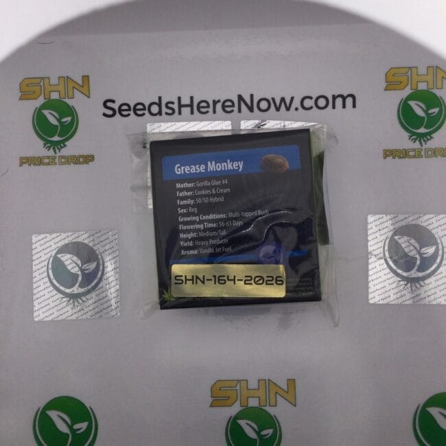 Exotic Genetix was founded by Exotic Mike in Tacoma, Washington in 2008. Grease Monkey is among the most recognized and decorated strains the program has ever produced, responsible for multiple Cannabis Cup wins and used as a parent in a significant portion of the subsequent catalog. Seeds Here Now has been a direct Exotic Genetix partner for over eight years.