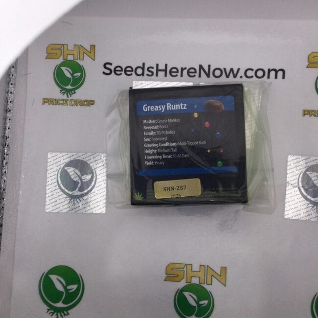 Greasy Runtz is retired. Exotic Genetix discontinued this line | a regular hybrid that crossed Grease Monkey, the program's award-winning GG4's—Cookies & Cream strain, with Runtz's candy-sweet fruity backbone. James Bean acquired this pack before it disappeared and placed it in the vault. Sealed since acquisition. Available now for the first time because retired genetics deserve one final chance to be grown.