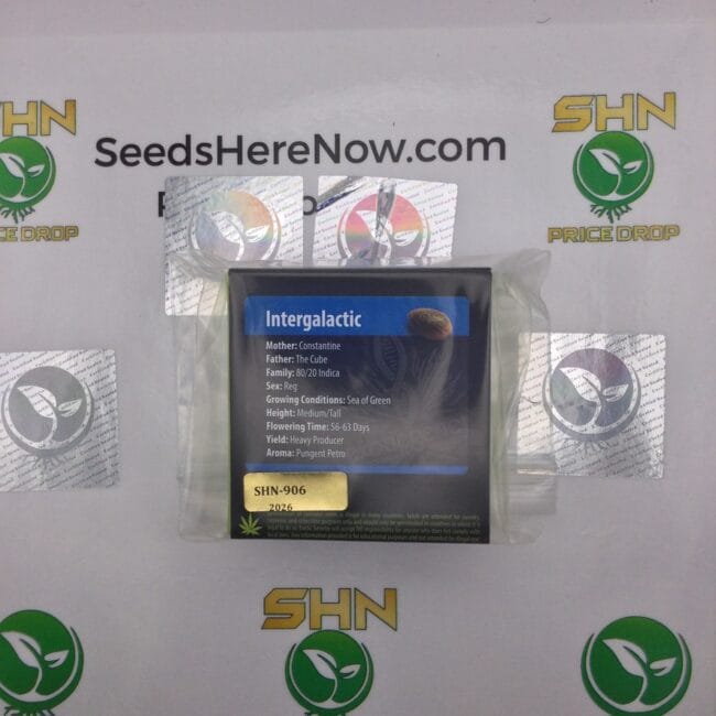 These packs have never left the collection. Intergalactic represents one of Exotic Genetix's bolder reg crosses | a genetics-first strain built for the breeder and the serious cultivator. Both lots offered here, SHN-906 and SHN-955, were acquired at collector market and stored under optimal conditions in James Bean's personal vault from day one.