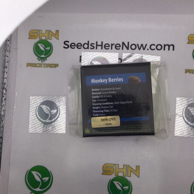 This pack has never left the collection. Monkey Berries is an Exotic Genetix feminized-seeds-vs-regular-seeds/">fem cross that brings together two of the most recognized strains in the modern collector market: Strawberries & Cream and Grease Monkey. Lot SHN-295 was acquired directly and has been stored in James Bean's personal vault under optimal conditions since the day it arrived.