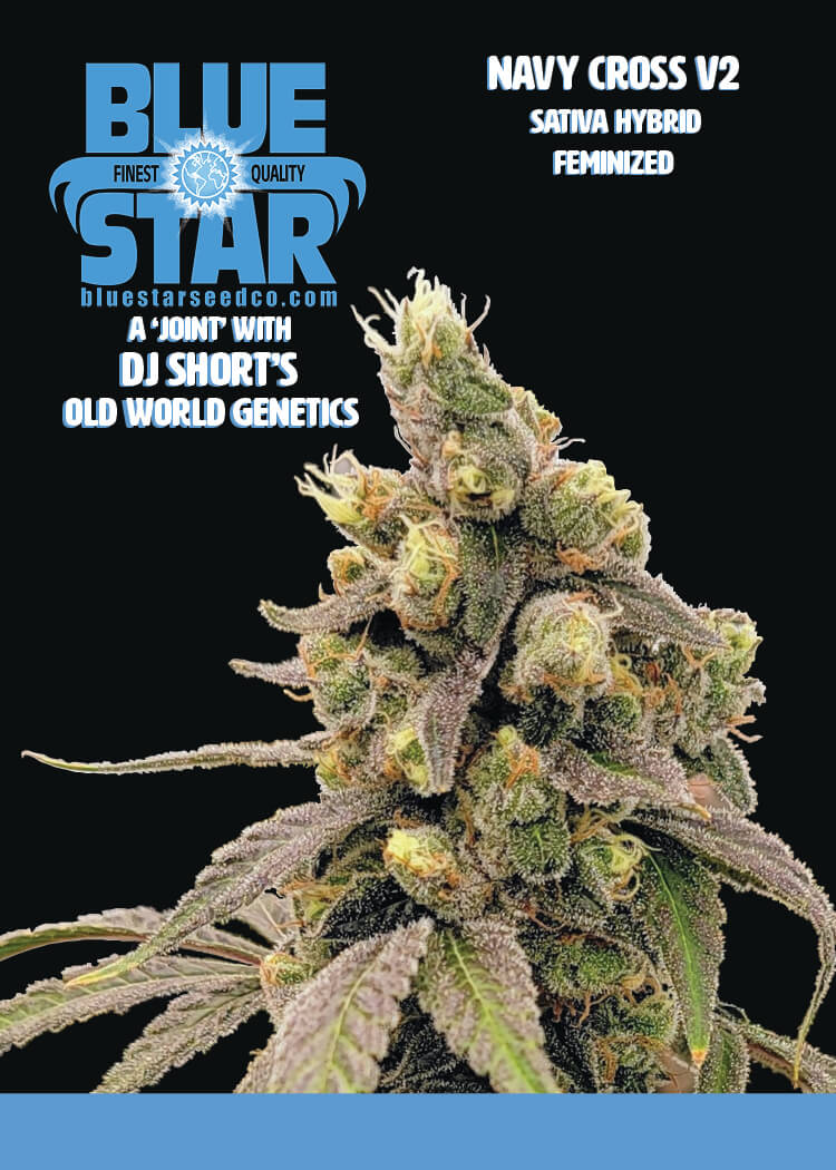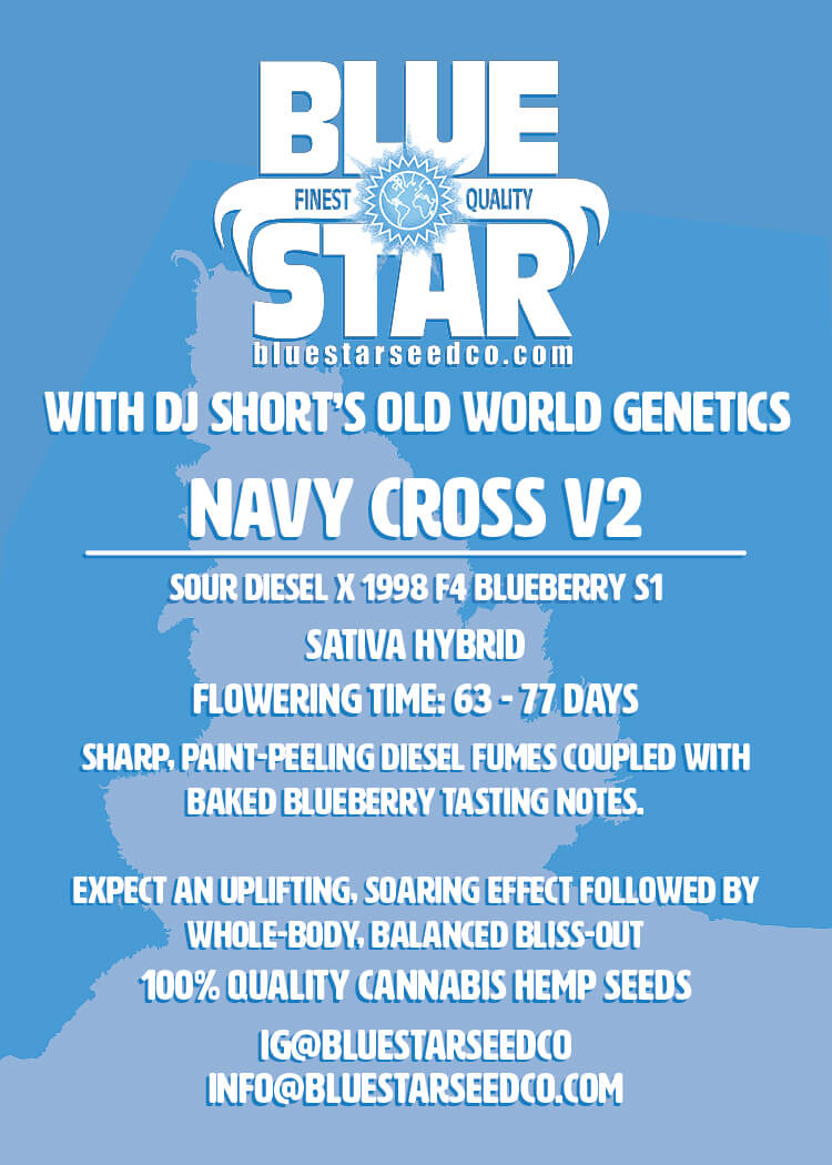 Navy Cross V2 feminized seeds bring together two powerhouse parents—Sour Diesel and DJ Short's 1998 F4 Blueberry S1—for a sativa-dominant cross that delivers hard-hitting flavor and effects. Blue Star Seed Co. engineered this one for growers who want sharp, fuel-forward terps layered over ripe blueberry sweetness.