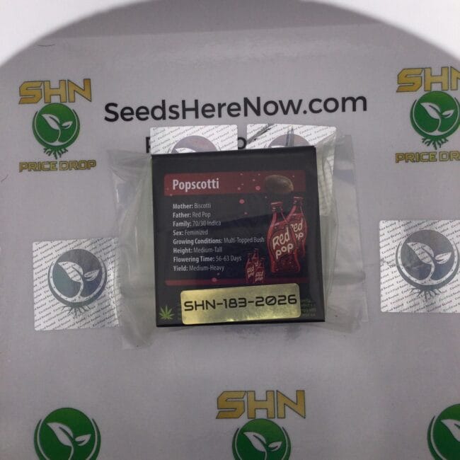 These packs have never left the collection. PopScotti is one of Exotic Genetix's most consistently acquired fem releases | a Biscotti's—Red Pop cross that appeared across ten separate Seeds Here Now lots, all of which are now in James Bean's personal vault. Lots available: SHN-183, SHN-302, SHN-316, SHN-474, SHN-543, SHN-757, SHN-778, SHN-792, SHN-806, and SHN-905. Every pack was acquired at collector market and has remained sealed in optimal vault storage since.