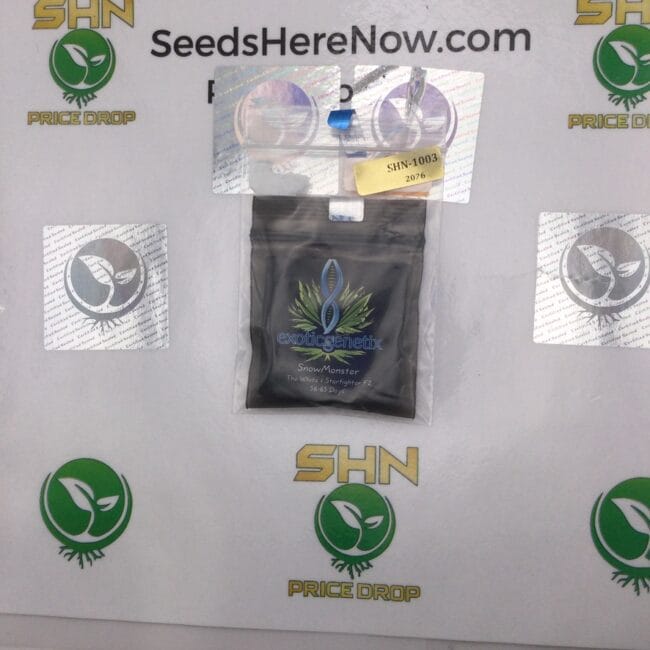 These packs have never left the collection. SnowMonster is Exotic Genetix's cross of The White and Starfighter F2 | and it is the highest-valued strain in the entire Seeds Here Now Exotic Genetix catalog. A comparable SnowMonster lot sold at collector market for $70,070 | the most any EG genetics have ever commanded at public collector market. Both lots in this listing | SHN-1003 and SHN-987 | were acquired through Seeds Here Now and have been stored in James Bean's personal vault under optimal conditions since acquisition.