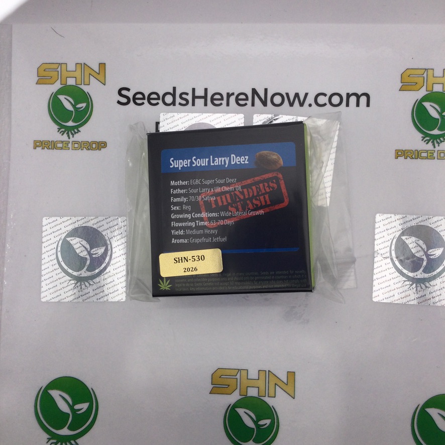 This pack has never left the collection. Super Sour Lazy Deez is one of the most distinctly fuel-forward entries in the Exotic Genetix catalog | a reg three-way cross of EGBC Super Sour Deez, Sour Larry, and Ultimate Chem'08 that builds its entire identity on sour, diesel, and chem terpene genetics. Lot SHN-530 was acquired directly and has been held in James Bean's personal vault under optimal conditions since.