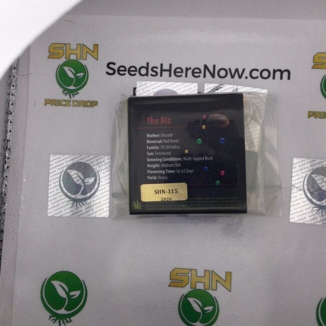 This pack has never left the collection. The Biz is an Exotic Genetix feminized-seeds-vs-regular-seeds/">fem cross of Biscotti and Red Runtz | two sweet-but-distinct dessert genetics crossed for a pheno pool with real flavor range. Lot SHN-315 was acquired directly and has been stored in James Bean's personal vault under optimal conditions since.