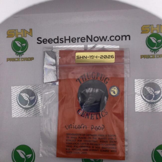 Unicorn Poop is the cross that made growers do a double-take: GMO (Garlic Cookies, heavy garlic/fuel/sulfur) crossed with Sophisticated Lady (Gromer's proprietary clean-resin female). The combination doesn't sound like it should work—you're stacking the most offensive terpene profile in modern cannabis against a Lady female selected for refinement. But that tension is the whole point. Collector lots for Unicorn Poop have at Seeds Here Now. This is the original pack—sealed, climate-controlled, Limited stock—when it's gone, it's gone.